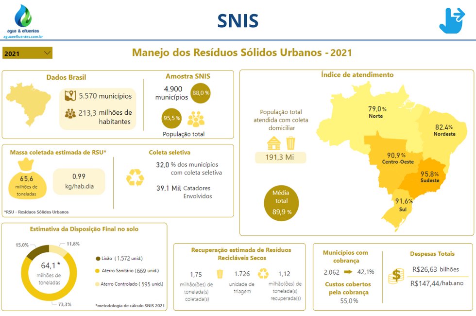 O SNIS é um sistema que reúne informações e indicadores sobre a prestação dos serviços de Água, Esgotos, manejo de Resíduos Sólidos e manejo de Águas Pluviais, provenientes dos prestadores que operam no Brasil.