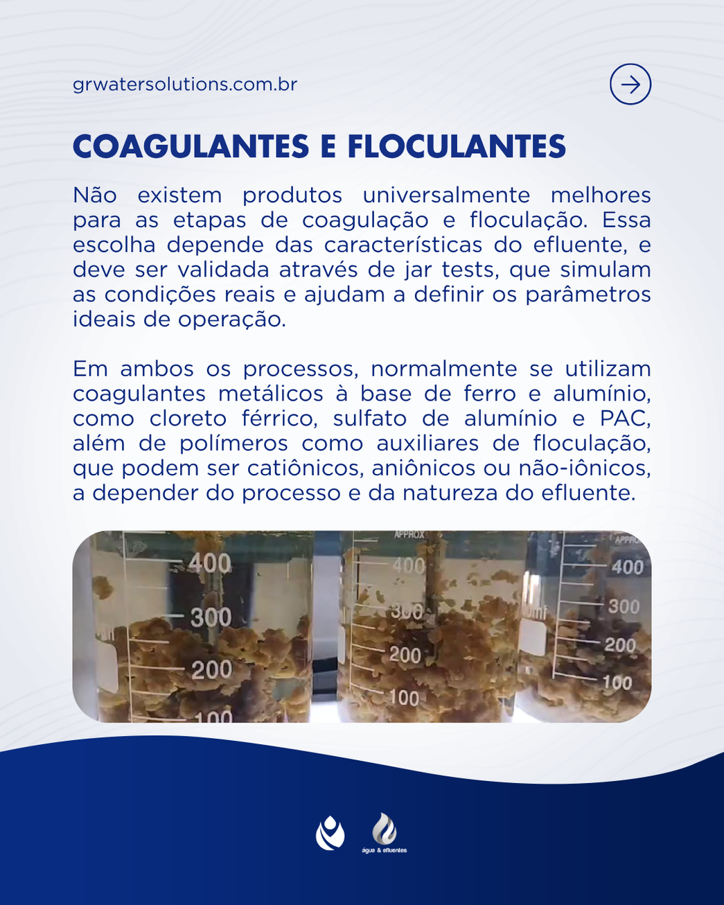 Não existem produtos universalmente melhores para as etapas de coagulação e floculação. Essa escolha depende das características do efluente, e deve ser validada através de jar tests, que simulam as condições reais e ajudam a definir os parâmetros ideais de operação.