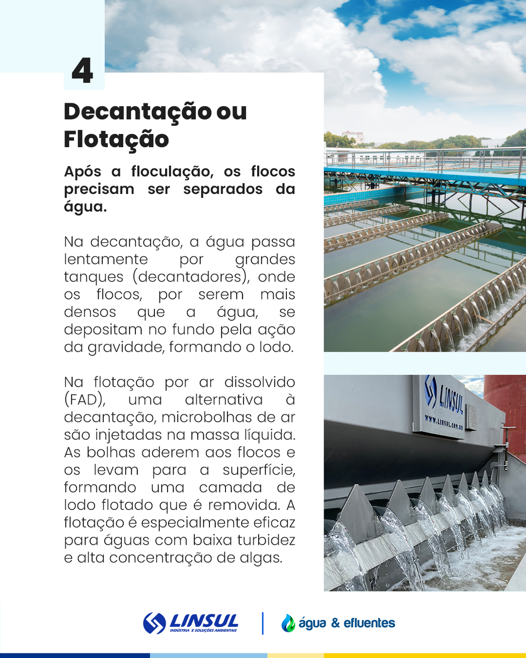 A Estação de Tratamento de Água (ETA) da Linsul Indústria e Soluções Ambientais é de fácil operação e manutenção, e baixo consumo de produtos químicos. É projetada e fornecida de acordo com as exigências de cada cliente. Em sua fabricação são utilizados materiais que possuem alto desempenho e alta resistência a corrosão, que pode ser causada pelos produtos químicos utilizados no tratamento de água, trazendo confiança ao consumidor final.