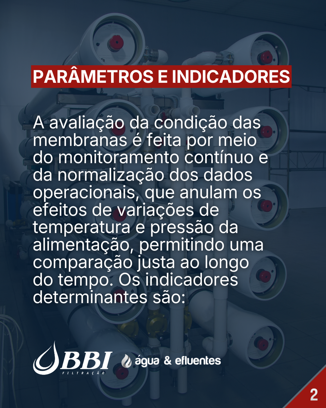 A avaliação da condição das membranas é feita por meio do monitoramento contínuo e da normalização dos dados operacionais, que anulam os efeitos de variações de temperatura e pressão da alimentação, permitindo uma comparação justa ao longo do tempo. Os indicadores determinantes são: