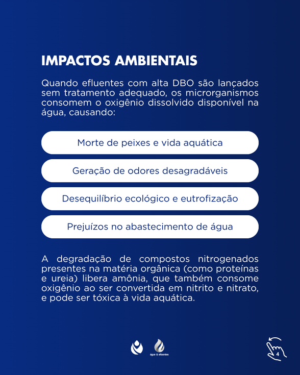 Nas imagens abaixo, explicamos de forma direta e técnica como a Demanda Bioquímica de Oxigênio impacta o meio ambiente, o que está por trás dos altos valores e quais processos são usados para reduzir essa carga nas estações de tratamento.
